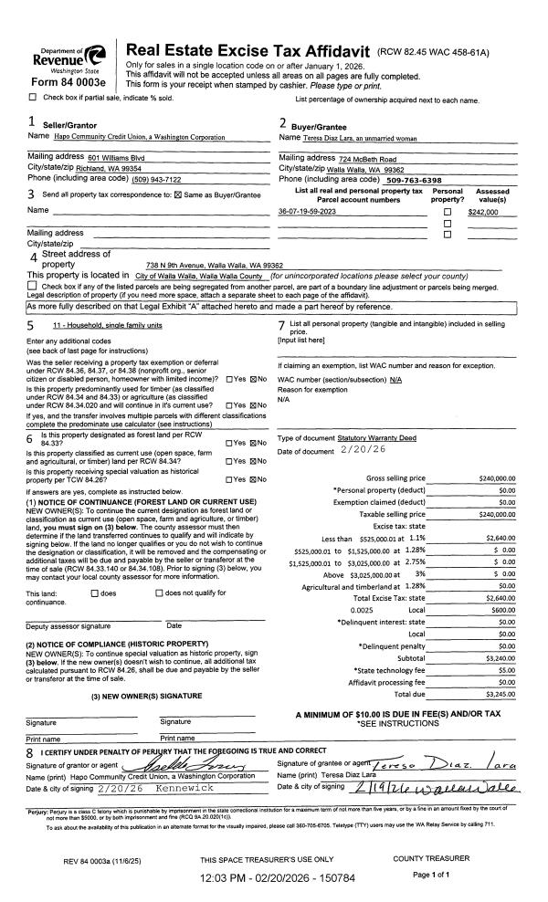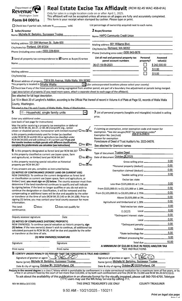 | 1 | 10/21/2025 | TRUSTEES D | TRUSTEE'S DEED | ANGELES CLAUDIA ALVAREZ | HAPO COMMUNITY CREDIT UNION | | | | 150211 | 2025-06472 |