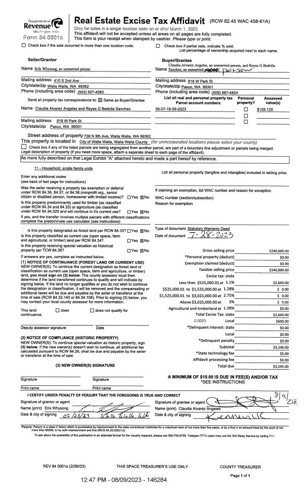 | 2 | 08/09/2023 | SWD | STATUTORY WARRANTY DEED | WHYSONG ERIK | ANGELES CLAUDIA ALVAREZ | | | $240,000.00 | 146284 | 2023-04575 |