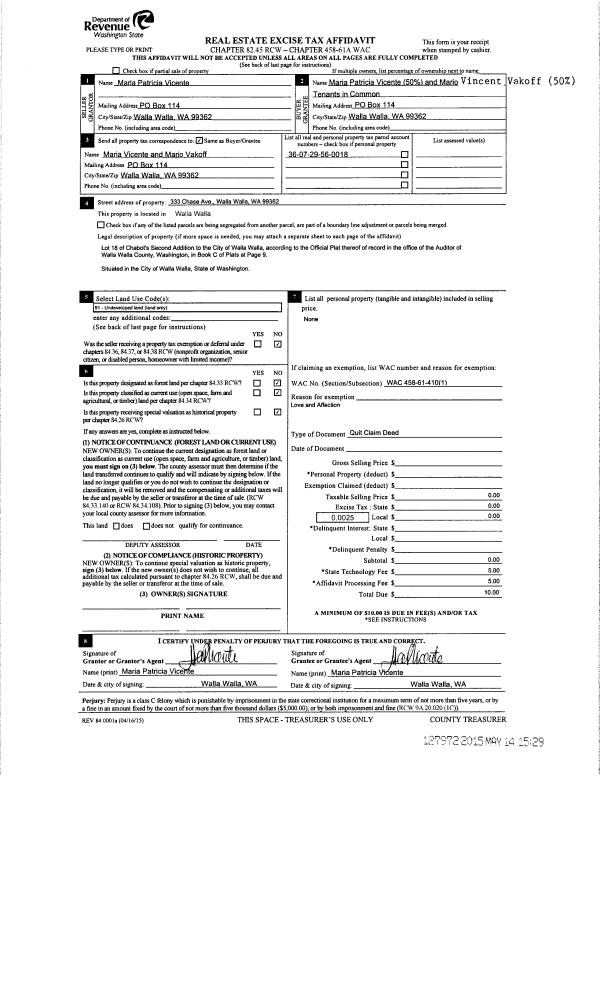| Mailing Address: | MARIO VINCENT VAKOFF PO BOX 114 WALLA WALLA, WA 99362 | % Ownership: | 100.0000000000% |