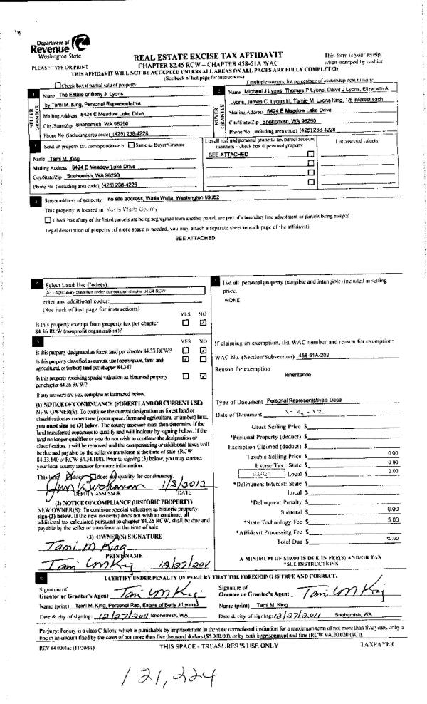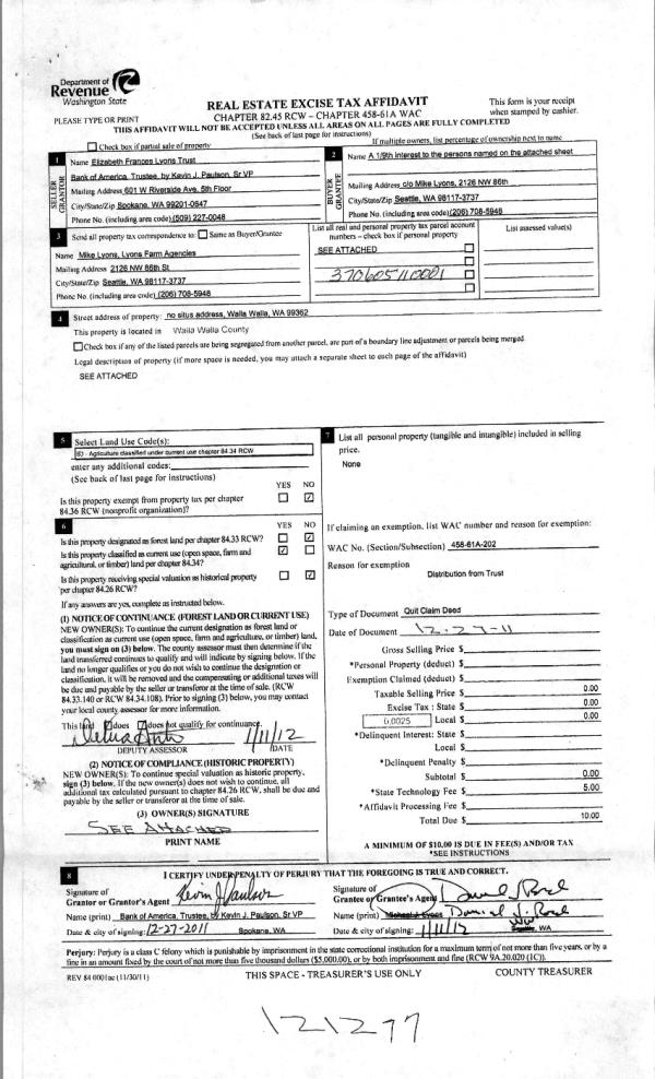 | 8 | 01/11/2012 | WARRANTY D | WARRANTY DEED | "LYONS, ELIZABETH F TRUST" | | | | | 121277 | 2012-00339 |
