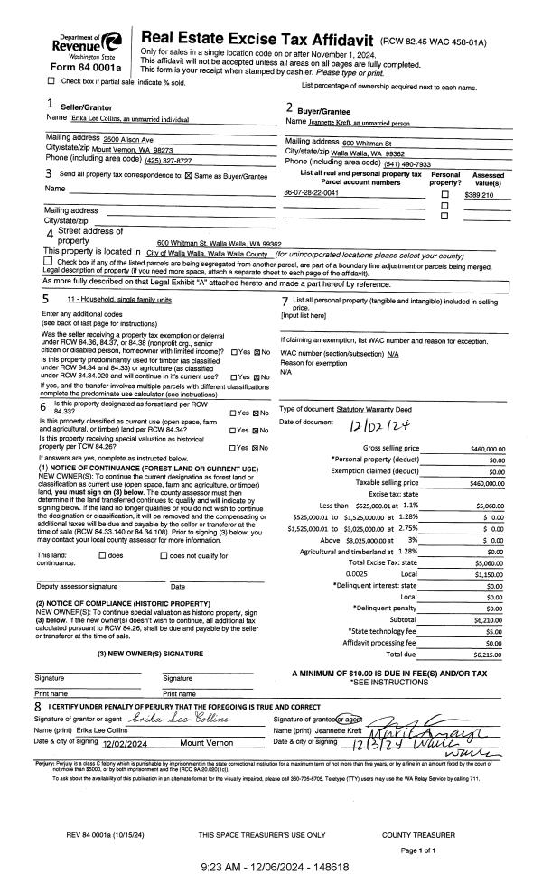 | 1 | 12/06/2024 | SWD | STATUTORY WARRANTY DEED | COLLINS ERIKA LEE | KREFT JEANNETTE | | | $460,000.00 | 148618 | 2024-07032 |