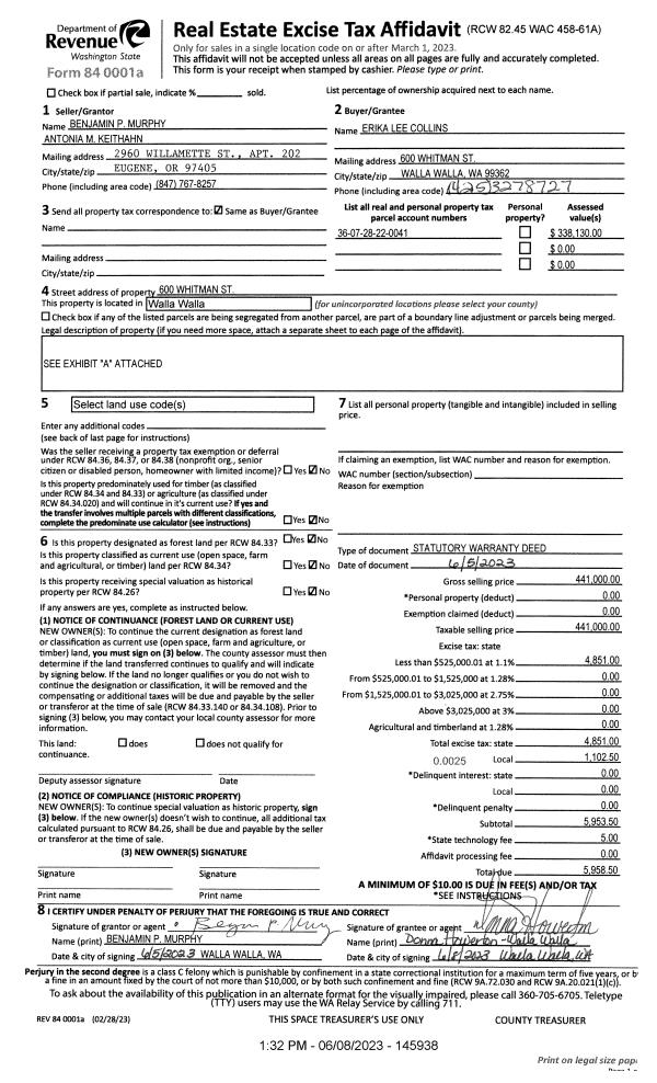 | 2 | 06/08/2023 | SWD | STATUTORY WARRANTY DEED | MURPHY BENJAMIN P | COLLINS ERIKA LEE | | | $441,000.00 | 145938 | 2023-03132 |