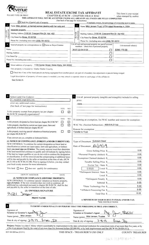 | Mailing Address: | 1729 CENTER ST WALLA WALLA, WA 99362 | % Ownership: | 100.0000000000% |
