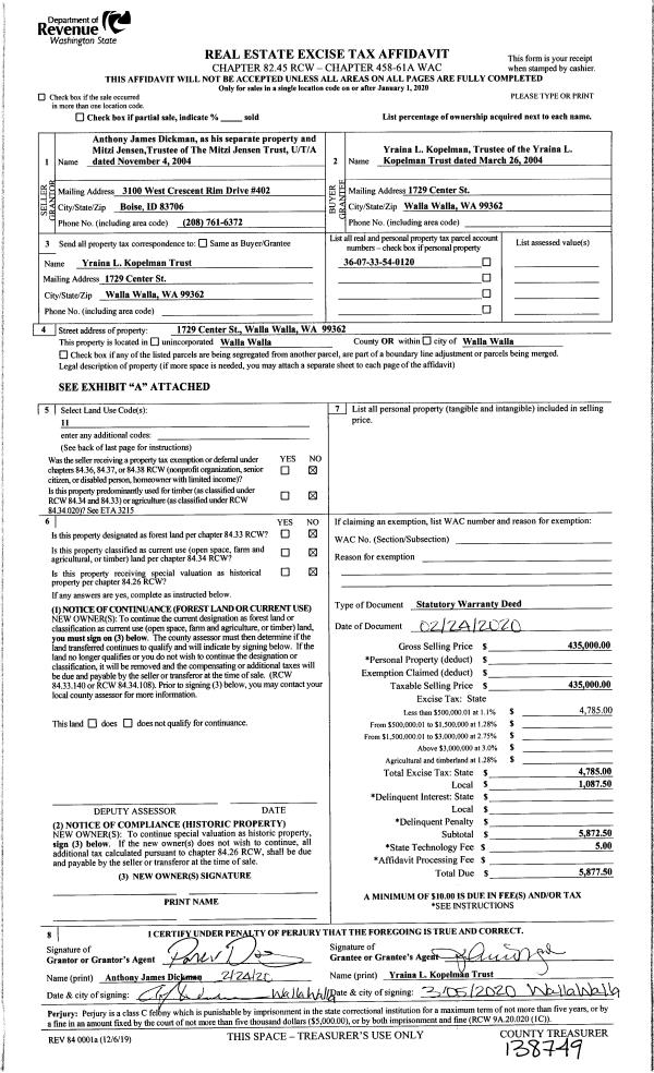 | 1 | 03/05/2020 | SWD | STATUTORY WARRANTY DEED | DICKMAN ANTHONY JAMES | YRAINA L KOPELMAN TRUST | | | $435,000.00 | 138749 | 2020-02083 |