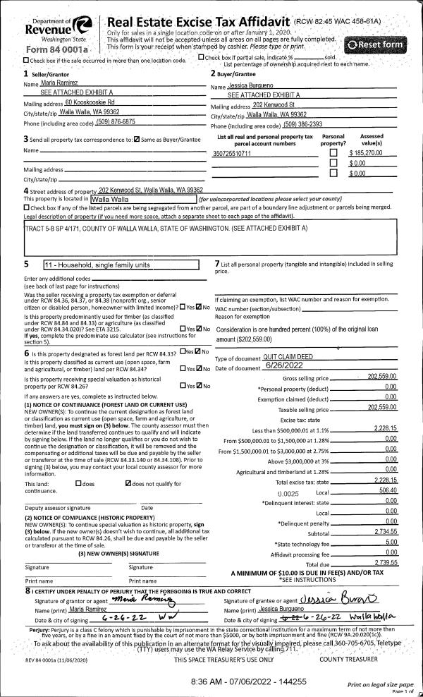 | 1 | 07/19/2022 | QCD | QUIT CLAIM DEED | BURGUENO JESSICA | BURGUENO JESSICA & RYAN KLASSEN | | | $202,559.00 | 144255 | 2022-06091 |