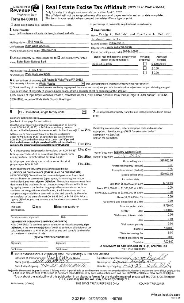 | 1 | 07/25/2025 | SWD | STATUTORY WARRANTY DEED | HARRISON JEFF & LAURIE | MELDAHL CRAIG A & CHARLENE L | | | $520,000.00 | 149755 | 2025-04336 |