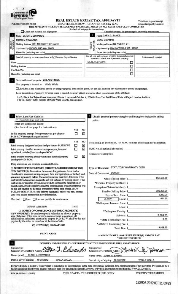 | 3 | 10/31/2012 | WARRANTY D | WARRANTY DEED | EDWARDS, ELTON L & FRITZI M | BANKS, GARY G & GENE M | | | $252,500.00 | 122906 | 2012-09624 |