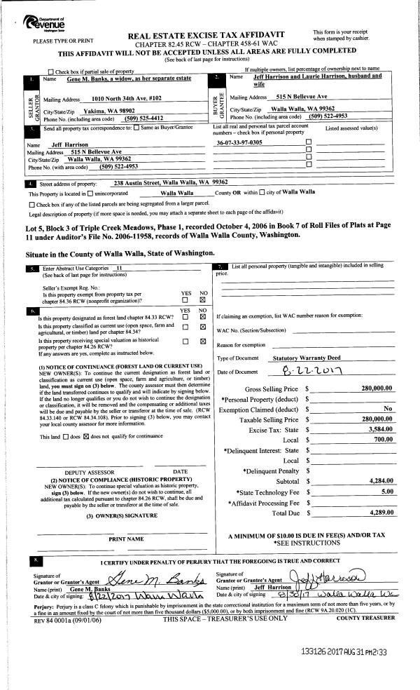 | 2 | 08/31/2017 | SWD | STATUTORY WARRANTY DEED | BANKS GENE M | HARRISON JEFF & LAURIE | | | $280,000.00 | 133126 | 2017-06849 |