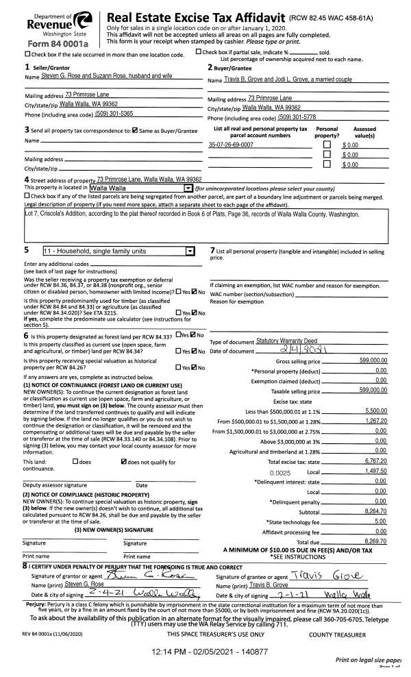 | 1 | 02/05/2021 | SWD | STATUTORY WARRANTY DEED | ROSE STEVEN G & SUZANN | GROVE TRAVIS B & JODI L | | | $599,000.00 | 140877 | 2021-01435 |