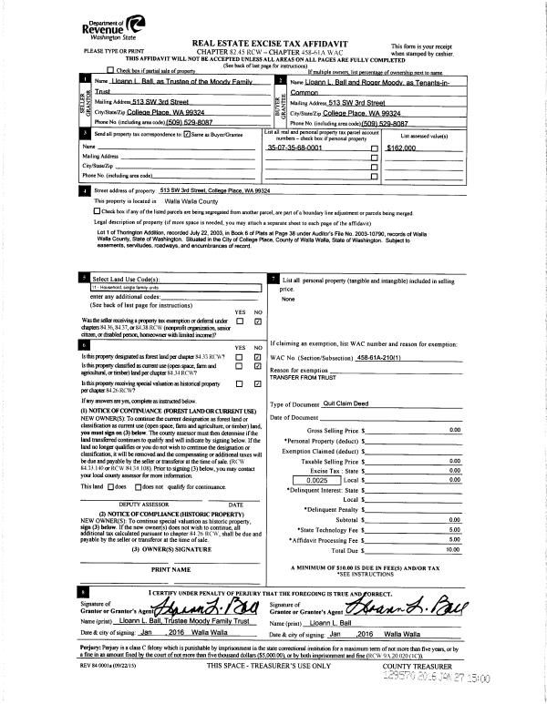 | 4 | 01/26/2016 | QCD | QUIT CLAIM DEED | BALL LLOANN L AS TRUSTEE OF THE | BALL LLOANN L | | | $0.00 | 129570 | 2016-00634 |