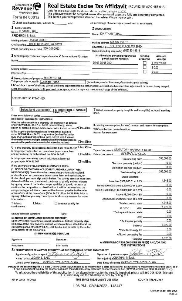 | 1 | 02/24/2022 | SWD | STATUTORY WARRANTY DEED | BALL FREDERICK E & LLOANN L | BALL JONATHAN T | | | $395,000.00 | 143447 | 2022-01637 |