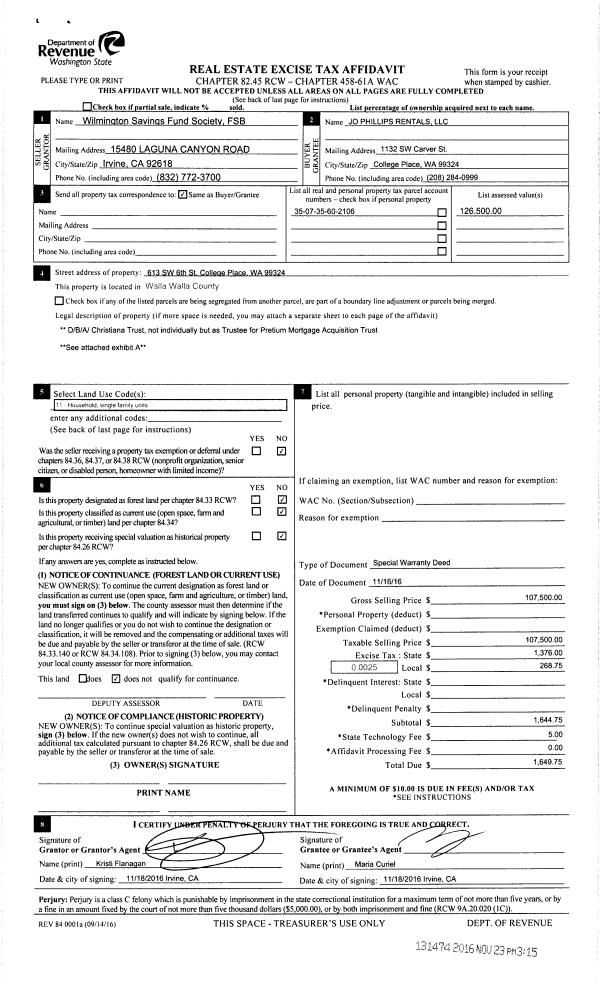| 1 | 11/23/2016 | SWP | Special Warranty Deed | WILMINGTON SAVINGS FUND SOCIETY | JO PHILLIPS RENTALS LLC | | | $107,500.00 | 131474 | 2016-09648 |