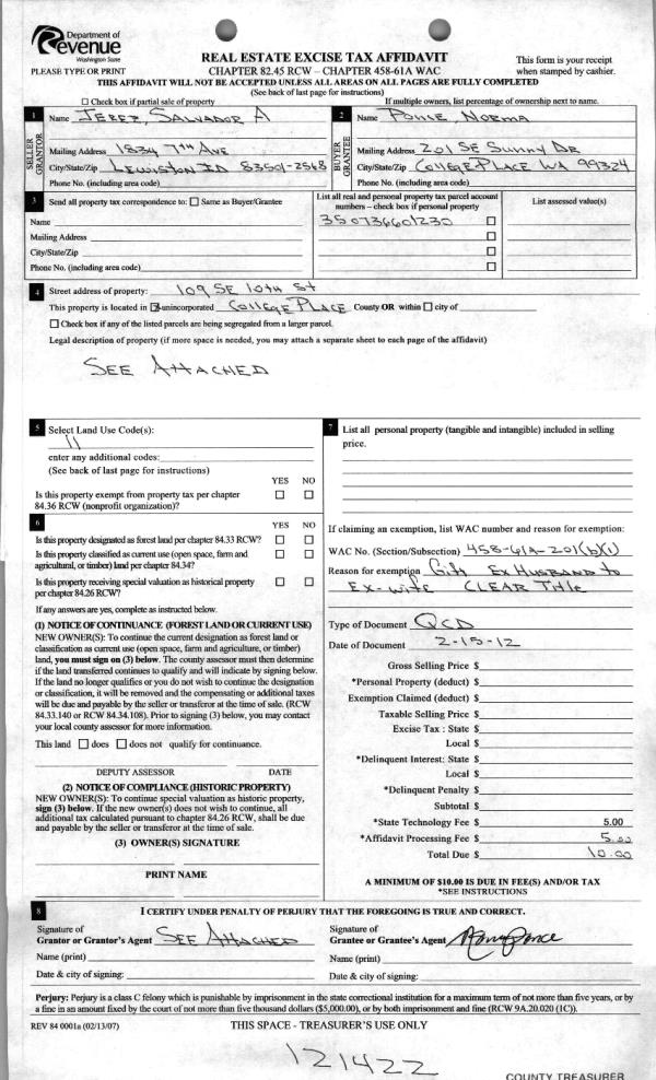 | 6 | 09/14/2007 | QCD | QUIT CLAIM DEED | JEREZ, SALVADOR & NORMA | JEREZ, SALVADOR A | | | | 113716 | 2007-10815 |