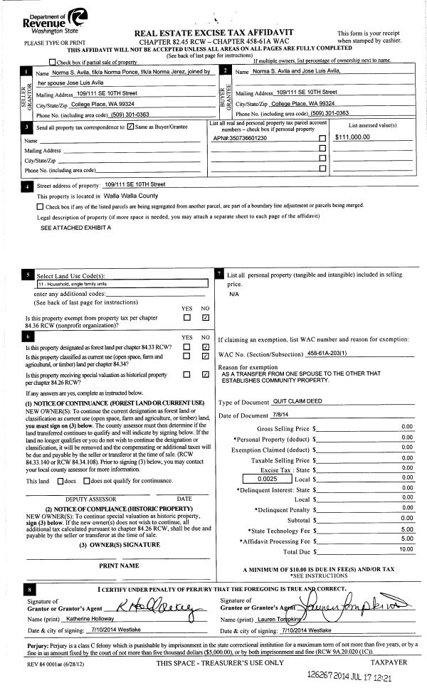 | 3 | 07/17/2014 | QCD | QUIT CLAIM DEED | PONCE NORMA | AVILA JOSE LUIS & NORMA S | | | | 126267 | 2014-05008 |