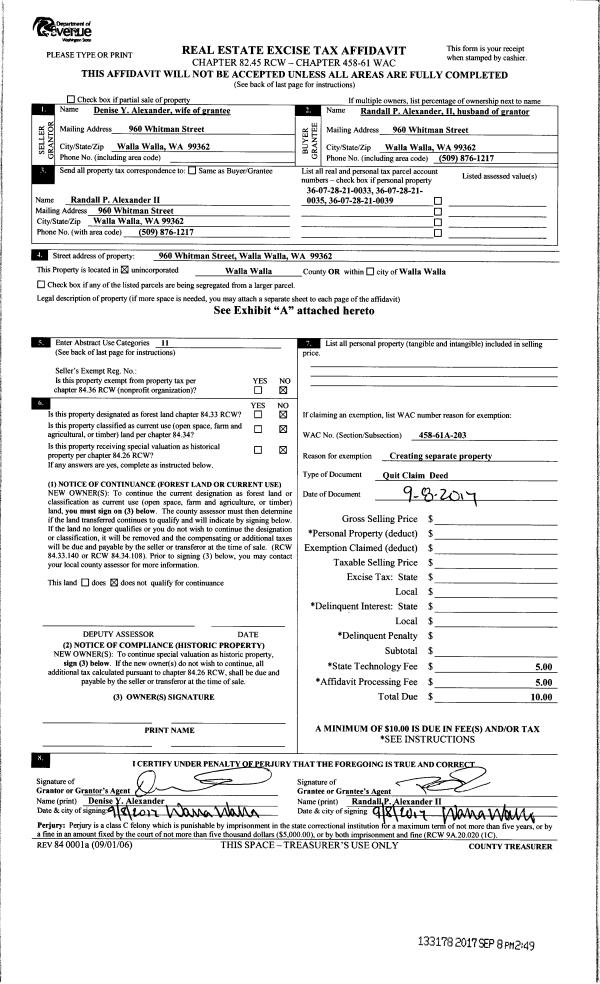 | 2 | 09/08/2017 | QCD | QUIT CLAIM DEED | ALEXANDER DENISE Y | ALEXANDER RANDALL P II | | 3-PARCELS | | 133178 | 2017-07063 |