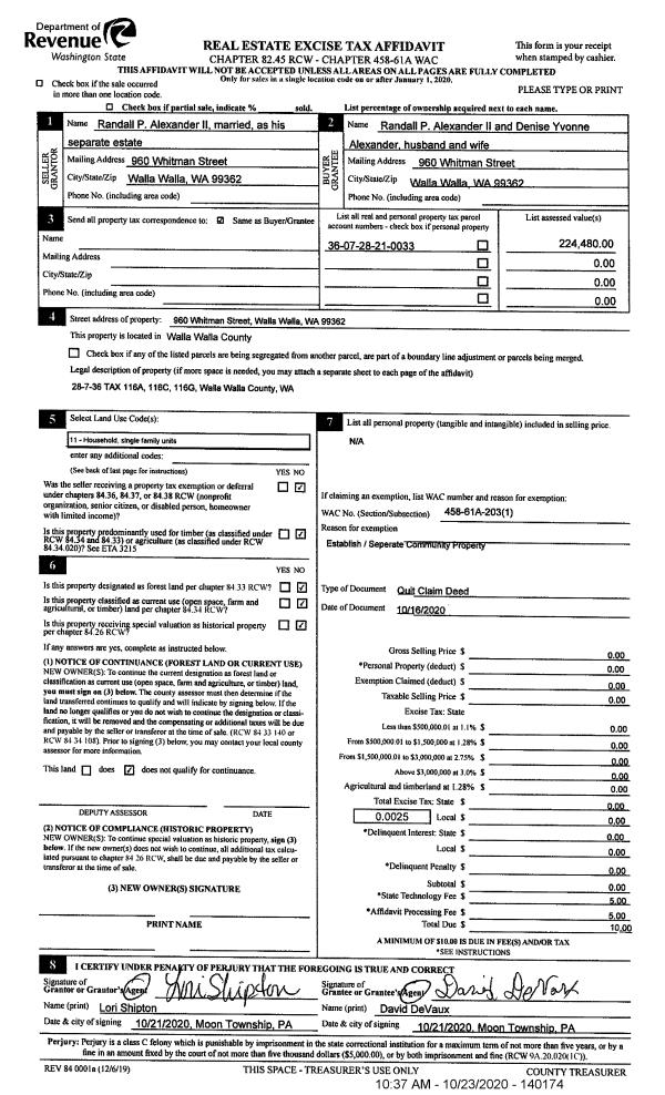 | 1 | 10/23/2020 | QCD | QUIT CLAIM DEED | ALEXANDER RANDALL P II | ALEXANDER RANDALL P II & DENISE YVONNE | | | | 140174 | 2020-11044 |