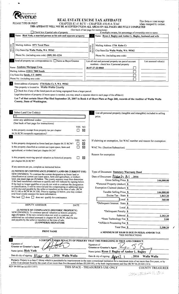 | 1 | 04/01/2016 | SWD | STATUTORY WARRANTY DEED | VOTH RICK | BAGLEY RYAN J & AMBER L | | | $144,000.00 | 129941 | 2016-02405 |