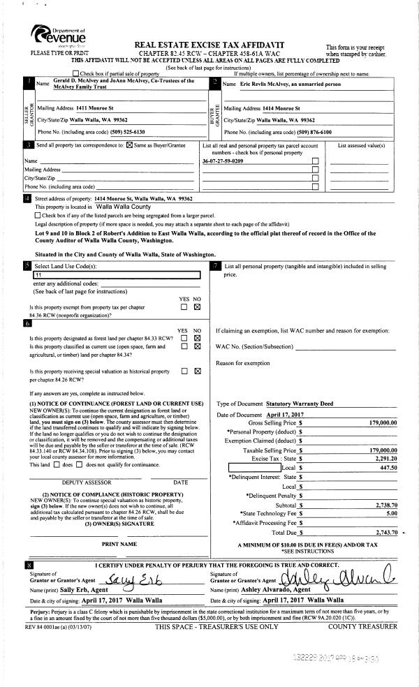 | 1 | 04/18/2017 | SWD | STATUTORY WARRANTY DEED | MC ALVEY FAMILY TRUST | MC ALVEY ERIC REVLIS | | | $179,000.00 | 132228 | 2017-02925 |