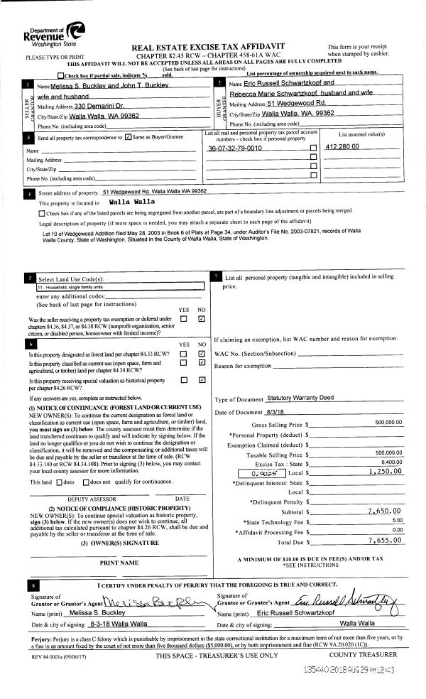 | 1 | 08/29/2018 | SWD | STATUTORY WARRANTY DEED | BUCKLEY JOHN T & MELISSA S | SCHWARTZKOPH ERIC RUSSELL & REBECCA MARIE | | | $500,000.00 | 135440 | 2018-07166 |