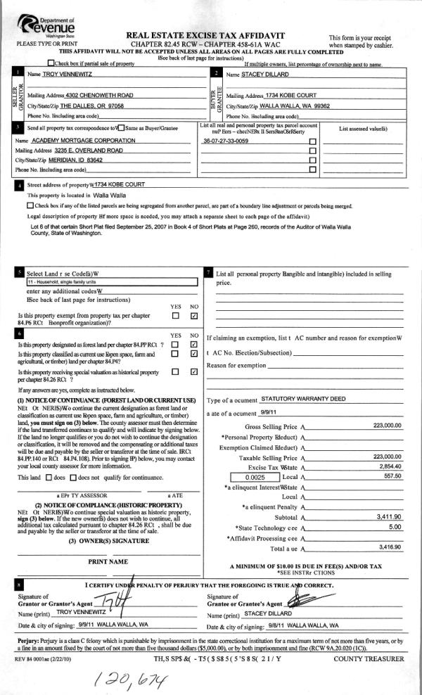 | 1 | 09/09/2011 | WARRANTY D | WARRANTY DEED | VENNEWITZ, TROY | DILLARD, STACEY | | | $223,000.00 | 120674 | 2011-07052 |