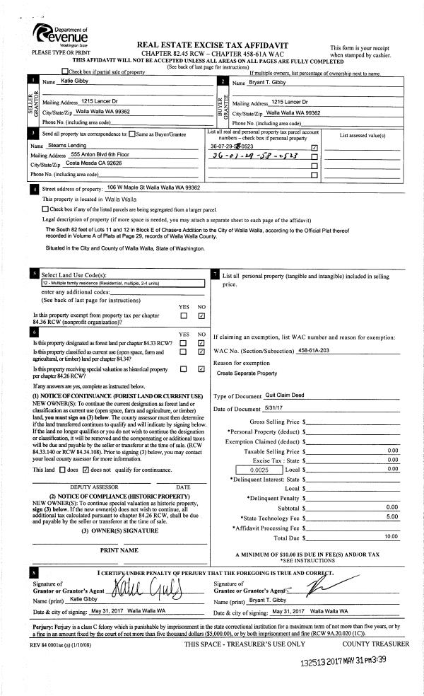 | 2 | 05/31/2017 | QCD | QUIT CLAIM DEED | GIBBY KATIE | GIBBY BRYANT T | | | | 132513 | 2017-04158 |