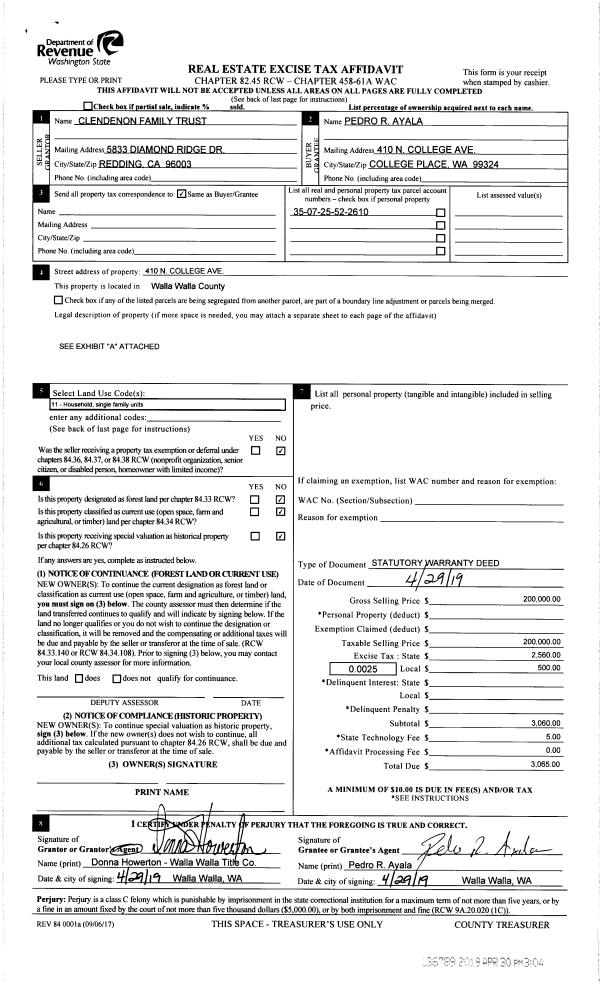 | 1 | 04/30/2019 | SWD | STATUTORY WARRANTY DEED | CLENDENON HARLEY M & JEANETTE L TRUSTEES OF THE | AYALA PEDRO R | | | $200,000.00 | 136789 | 2019-02806 |
