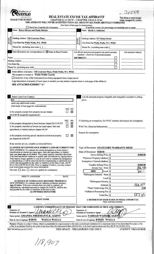 | 2 | 08/24/2010 | WARRANTY D | WARRANTY DEED | MERSON, BRUCE L & PAULA K | ANDERSON, DAVID A | | | $8,000.00 | 118907 | 2010-06563 |