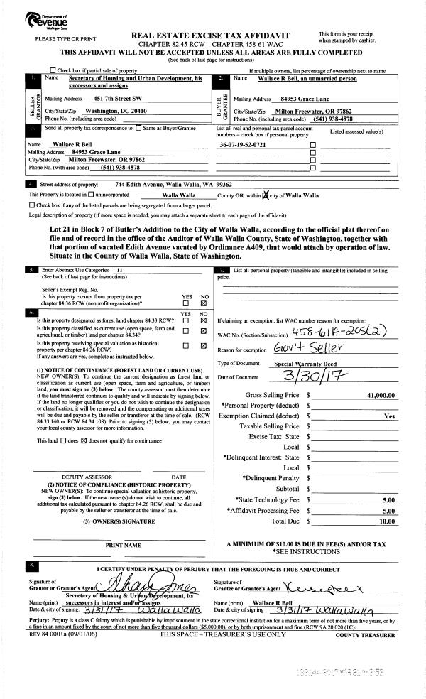 | 2 | 03/31/2017 | SWP | Special Warranty Deed | SECRETARY OF HOUSING & URBAN DEVELOPMENT | BELL WALLACE R | | | $41,000.00 | 132144 | 2017-02494 |