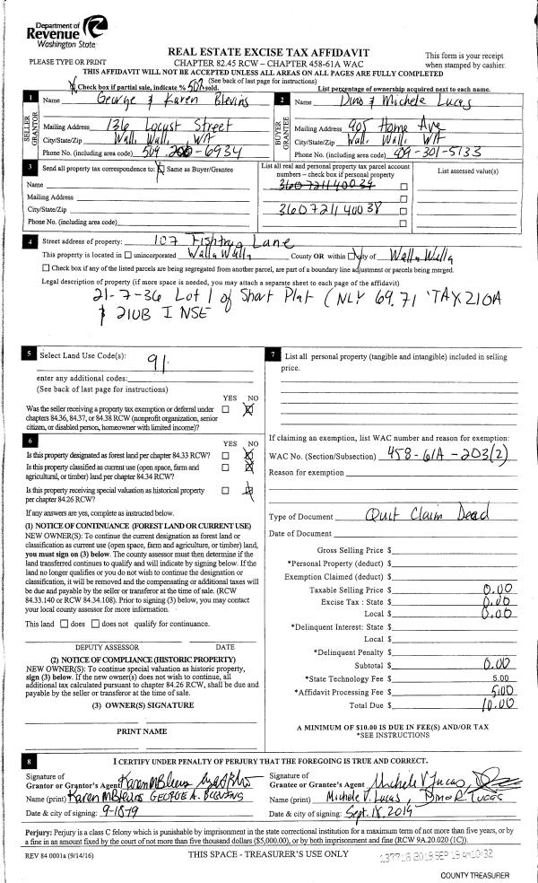 | 2 | 09/18/2019 | QCD | QUIT CLAIM DEED | BLEVINS GEORGE A & KAREN M | BELVINS GEORGE & KAREN 50% | | | $0.00 | 137718 | 2019-07349 |