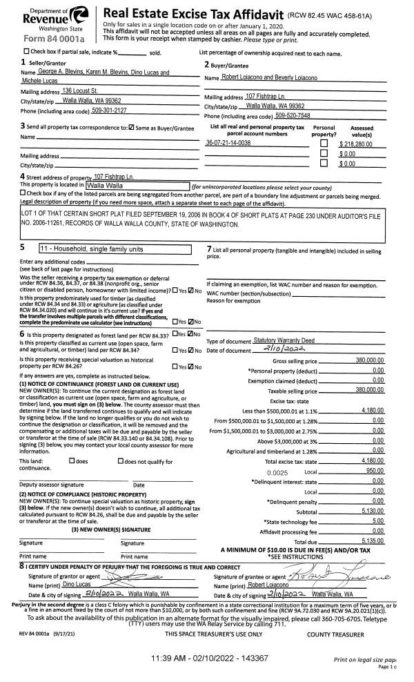 | 1 | 02/10/2022 | SWD | STATUTORY WARRANTY DEED | BELVINS GEORGE & KAREN 50% | LOIACONO ROBERT & BEVERLY | | | $380,000.00 | 143367 | 2022-01223 |