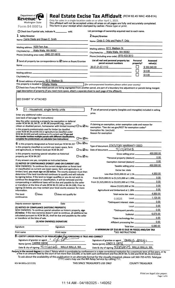 | 1 | 04/18/2025 | SWD | STATUTORY WARRANTY DEED | SMITH SHAWN E & CARRIE DIEDE | ORTIZ CINDY S & PEDRO P | | | $450,000.00 | 149262 | 2025-02071 |