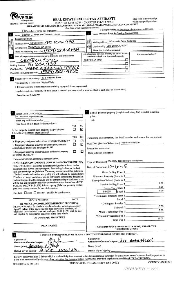 | 4 | 10/06/2015 | DFL | DEED IN LIEU OF FORECLOSURE | JONES GEOFFREY C & TAMARA J | UMPQUA BANK FKA STERLING SAVINGS BANK | | | | 129325 | 2015-10565 |