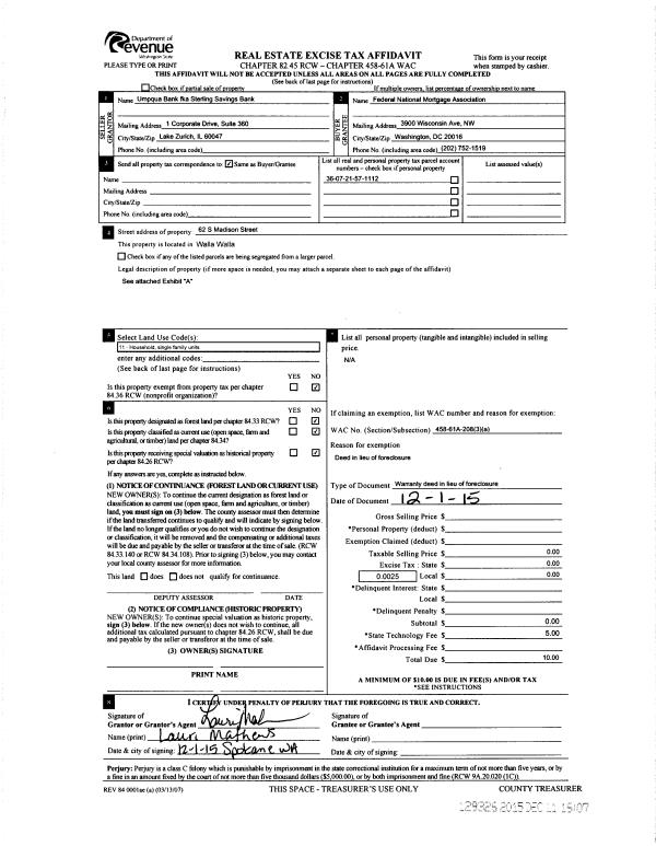 | 3 | 12/01/2015 | WARRANTY D | WARRANTY DEED | UMPQUA BANK FKA STERLING SAVINGS BANK | FEDERAL NATIONAL MORTGAGE ASSOCIATION | | | | 129326 | 2015-10568 |