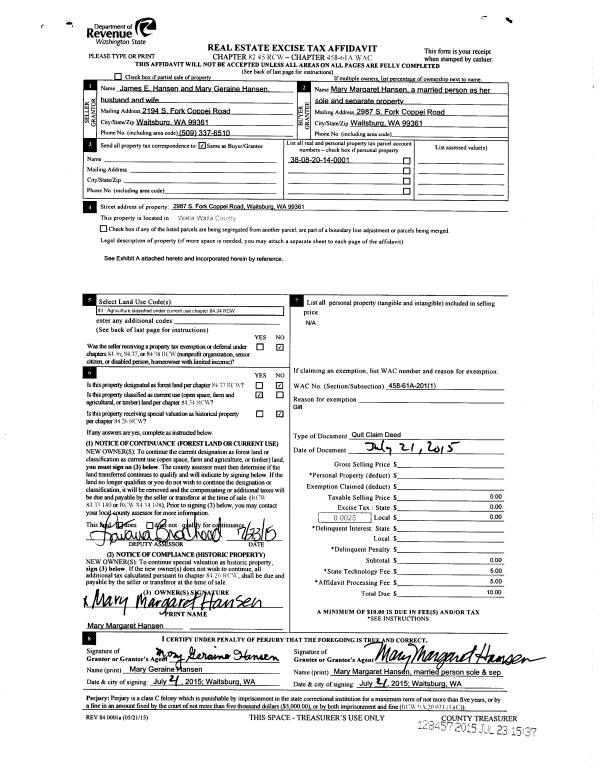 | 2 | 07/21/2015 | QCD | QUIT CLAIM DEED | HANSEN JIM | HANSEN MARY MARGARET | | | $0.00 | 128457 | 2015-06307 |