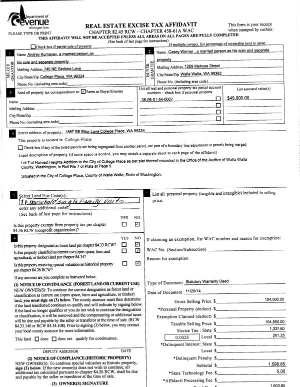 | 3 | 11/20/2014 | SWD | STATUTORY WARRANTY DEED | KURNAYEV ANDREY | WERNER CASEY | | | $104,500.00 | 126980 | 2014-08431 |