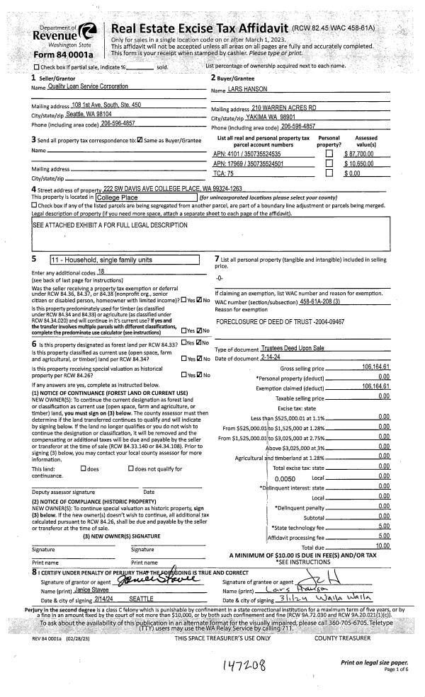 | 2 | 03/01/2024 | TRUSTEES D | TRUSTEE'S DEED | JONES JAMES A JR | HANSON LARS | | 2-PARCELS | $106,164.00 | 147208 | 2024-01048 |