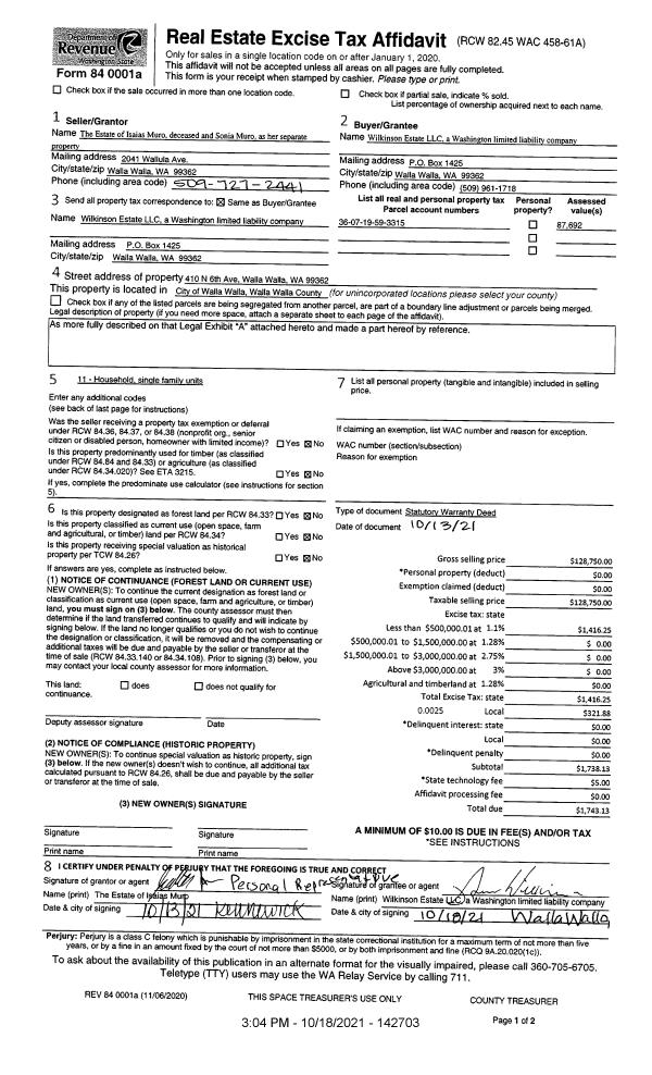 | 4 | 10/18/2021 | SWD | STATUTORY WARRANTY DEED | MURO ISAIAS J & SONIA E | WILKINSON ESTATES LLC | | | $128,750.00 | 142703 | 2021-12647 |