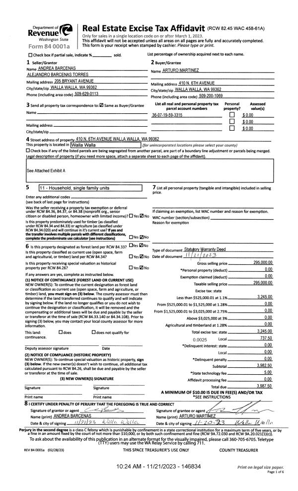 | 2 | 11/21/2023 | SWD | STATUTORY WARRANTY DEED | BARCENAS ANDREA & ALEJANDRO BARCENAS TORRES | MARTINEZ ARTURO | | | $295,000.00 | 146834 | 2023-06810 |