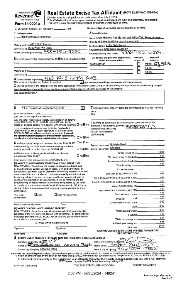 | 1 | 11/19/2024 | QCD | QUIT CLAIM DEED | MARTINEZ ARTURO | MARTINEZ ARTURO & ADRIAN TELLO REYES | | | | 148241 | 2024-06691 |