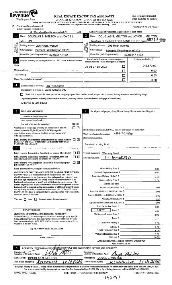 | 1 | 12/03/2020 | WARRANTY D | WARRANTY DEED | MELTON DOUGLAS S & JOYCE L | MELTON LIVING TRUST | | | | 140471 | 2020-12758 |