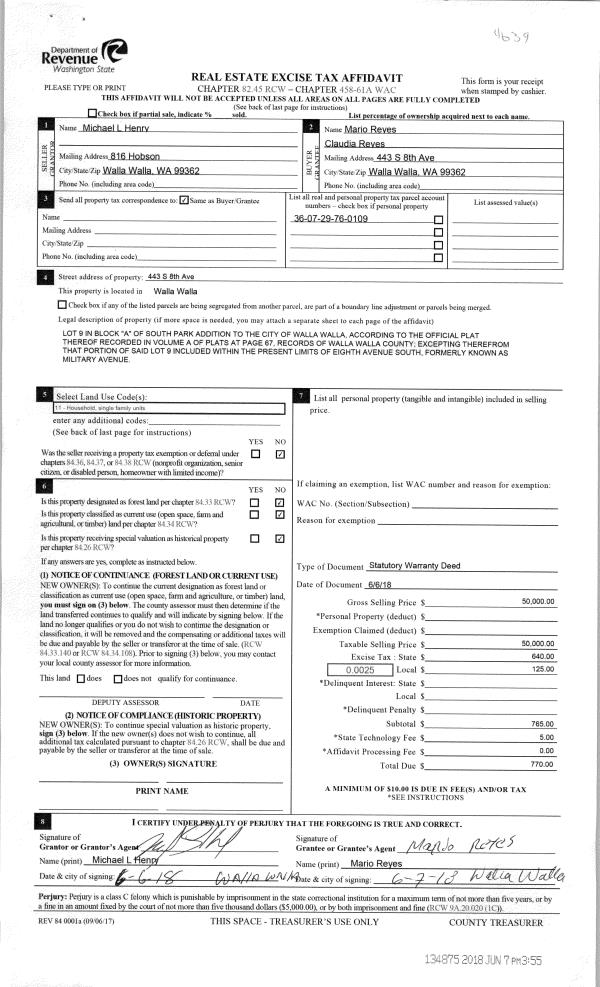 | 1 | 06/07/2018 | SWD | STATUTORY WARRANTY DEED | HENRY MICHAEL L | REYES MARIO & CLAUDIA | | | $50,000.00 | 134875 | 2018-04575 |
