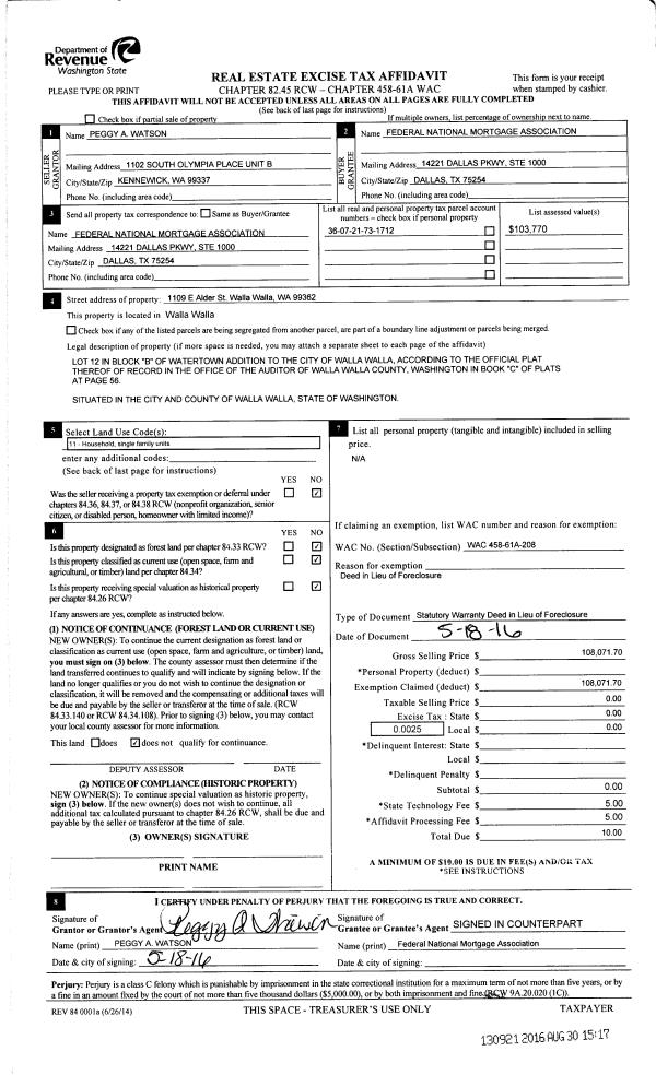 | 3 | 08/30/2016 | DFL | DEED IN LIEU OF FORECLOSURE | WATSON LEONARD G & PEGGY A | FEDERAL NATIONAL MORTGAGE ASSOC | | | $108,071.00 | 130921 | 2016-06983 |