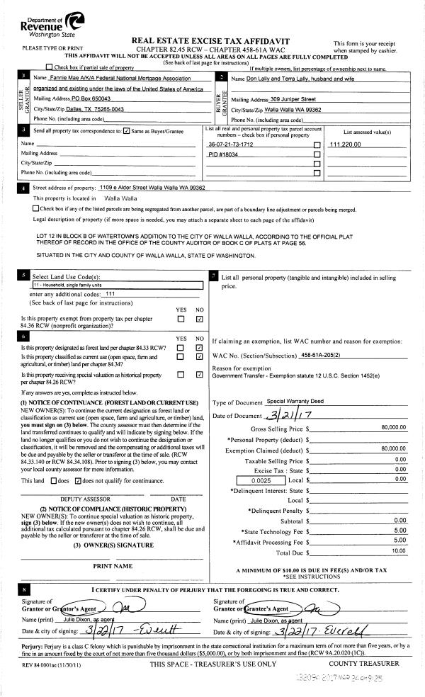 | 2 | 03/24/2017 | SWP | Special Warranty Deed | FEDERAL NATIONAL MORTGAGE ASSOC | LALLY DON & TERRA J | | | $80,000.00 | 132094 | 2017-02231 |