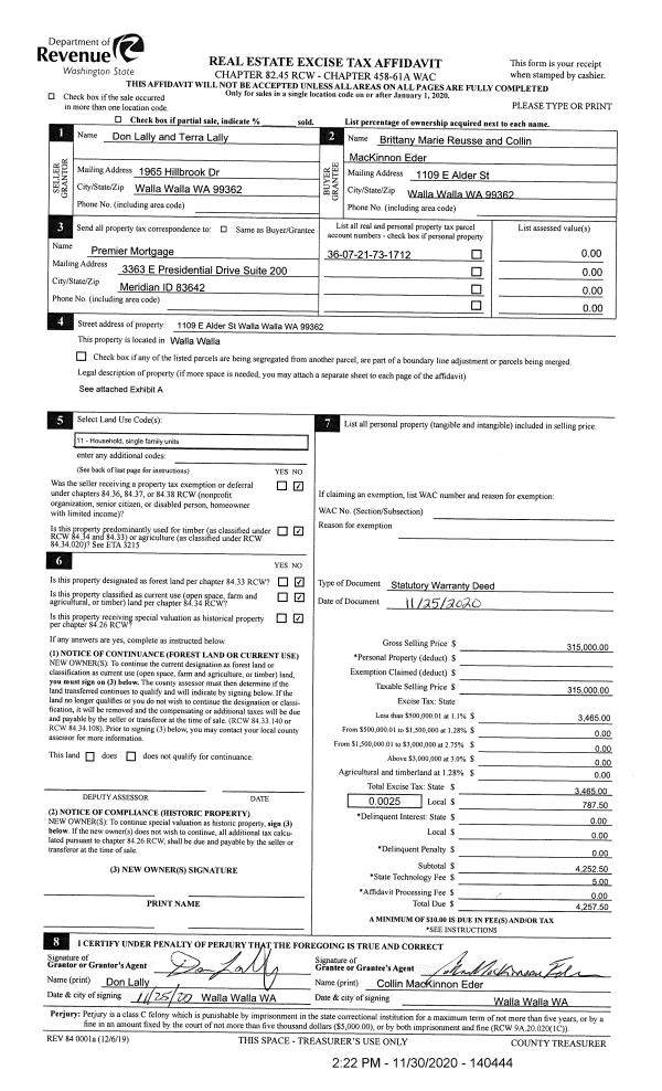 | 1 | 11/30/2020 | SWD | STATUTORY WARRANTY DEED | LALLY DON & TERRA J | REUSSE BRITTANY MARIE & COLLIN MACKINNON EDER | | | $315,000.00 | 140444 | 2020-12608 |