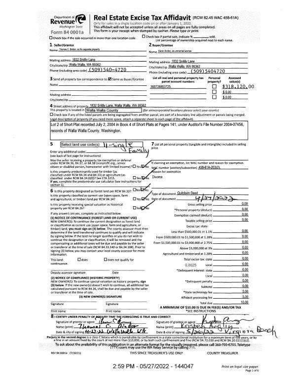 | 1 | 05/27/2022 | QCD | QUIT CLAIM DEED | BINDER THOMAS C | BINDER KAREN | | | $0.00 | 144047 | 2022-04628 |