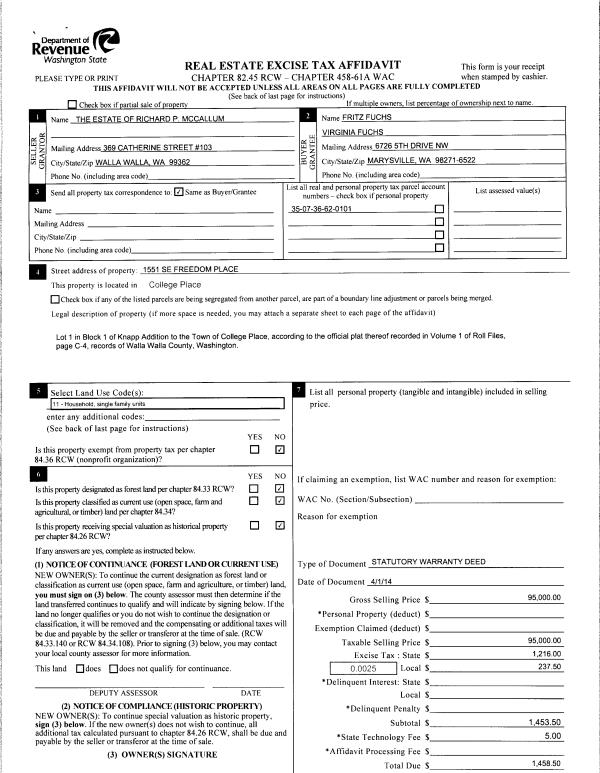 | 2 | 04/01/2014 | SWD | STATUTORY WARRANTY DEED | MC CALLUM RICHARD P | FUCHS FRITZ & VIRGINIA | | | $95,000.00 | 125658 | 2014-02225 |