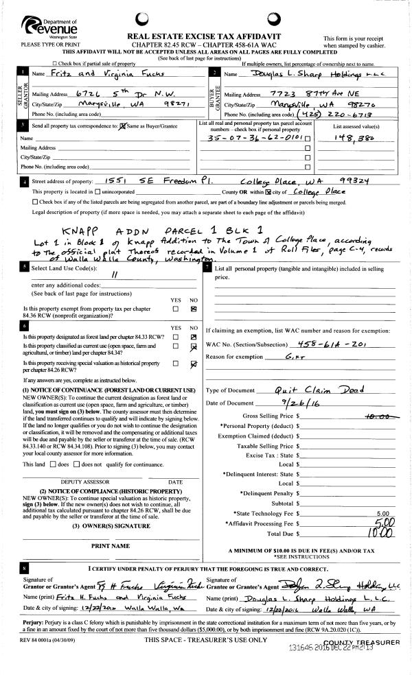 | 1 | 12/22/2016 | QCD | QUIT CLAIM DEED | FUCHS FRITZ & VIRGINIA | DOUGLAS L SHARP HOLDINGS LLC | | | $0.00 | 131646 | 2016-10541 |