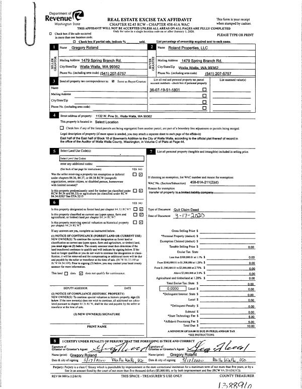 | 2 | 04/06/2020 | QCD | QUIT CLAIM DEED | ROLAND GREGORY | ROLAND PROPERTIES LLC | | | $0.00 | 138896 | 2020-02995 |