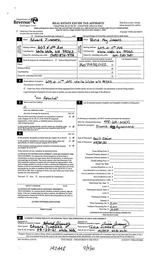 | 1 | 03/14/2022 | QCD | QUIT CLAIM DEED | JIMENEZ EDWARD & TRICIA K | JIMENEZ TRICIA KAY | | | | 142448 | 2022-02136 |