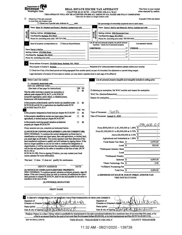 | 2 | 08/21/2020 | SWD | STATUTORY WARRANTY DEED | HANSHEW MARTY W & RENEA I | MCCOY TRAVIS J & ELAINA M | | | $370,000.00 | 139739 | 2020-08321 |